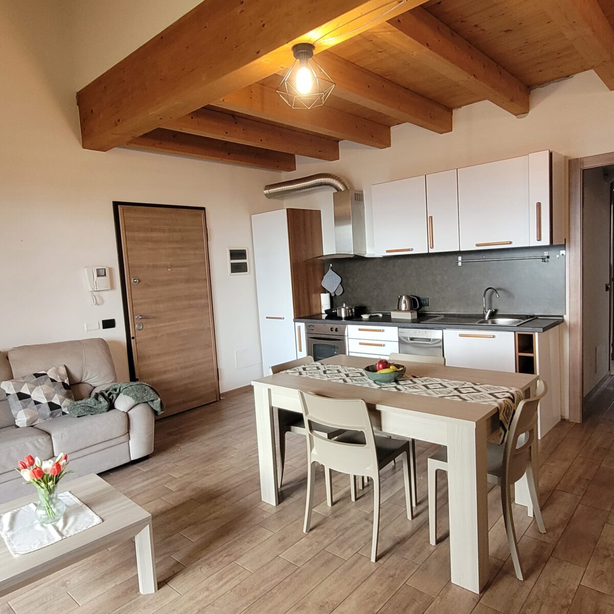- Open space con cucina attrezzata, tavolo e sedie, zona salotto con divano e televisore