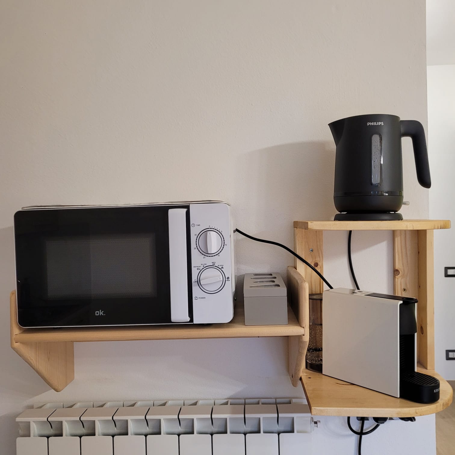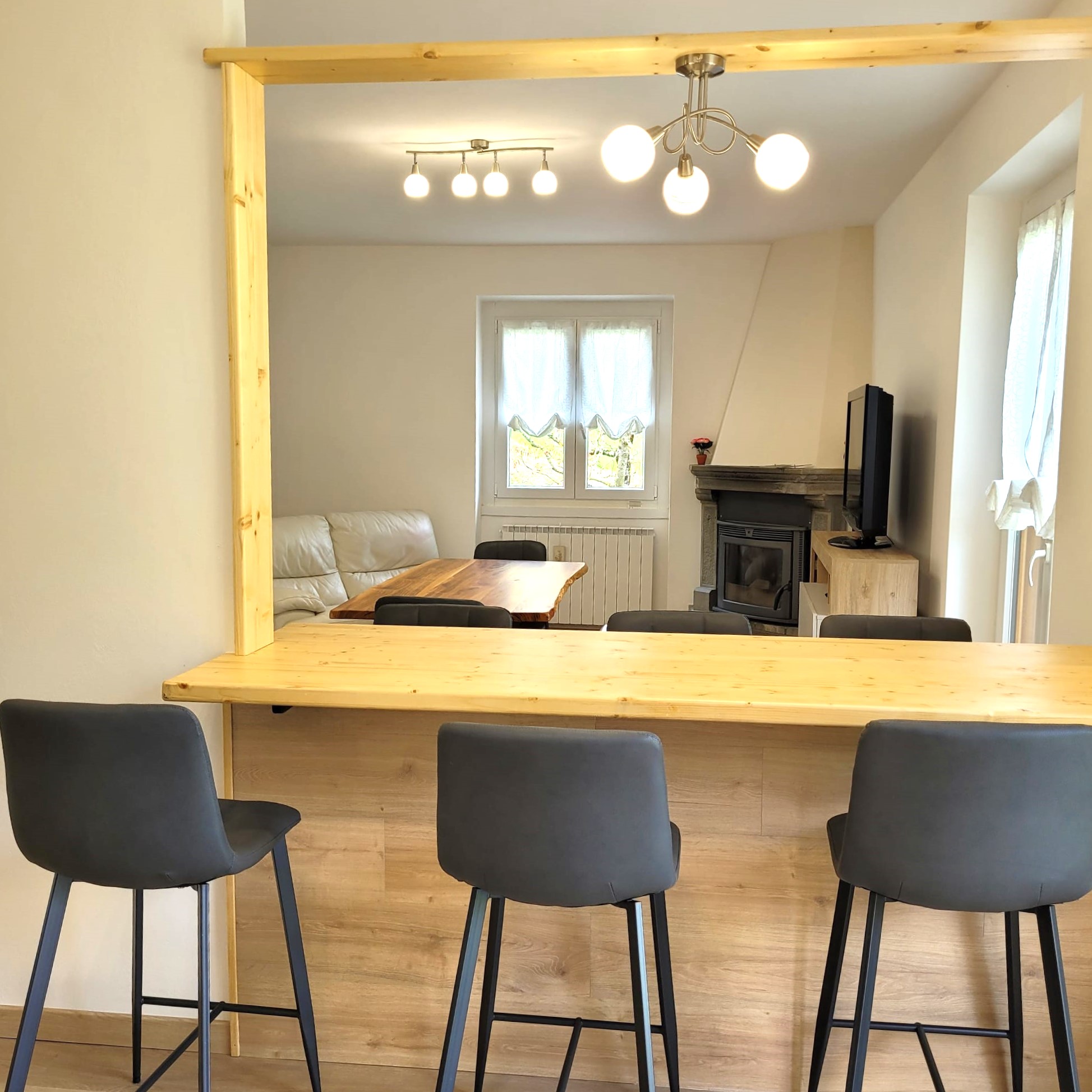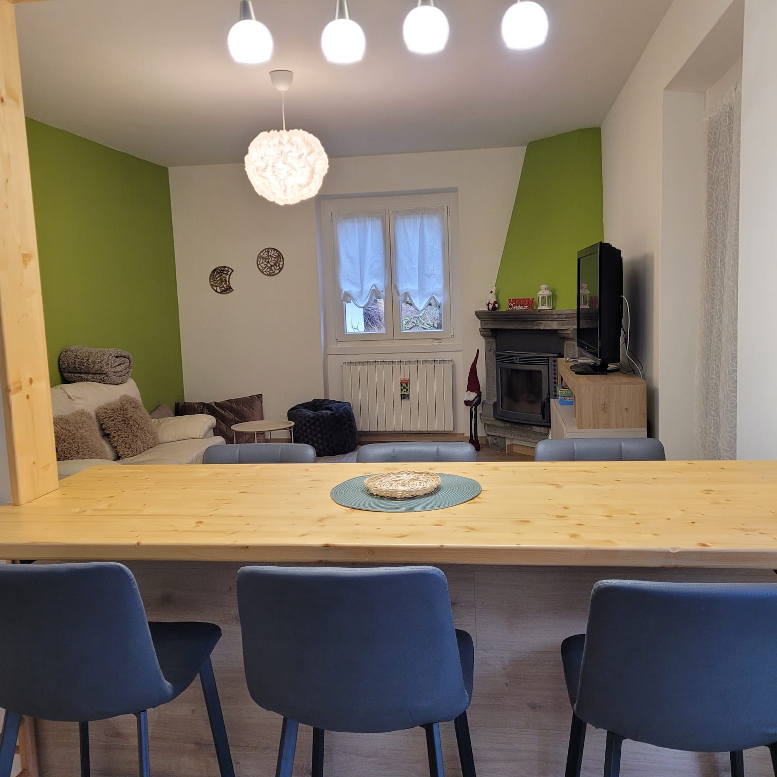 - Open space con cucina attrezzata e macchina caffè Nespresso, zona salotto con tavolo, camino a pallets, divano e televisore