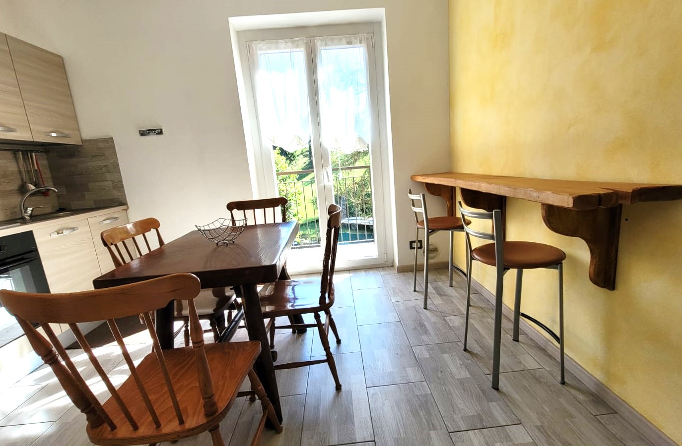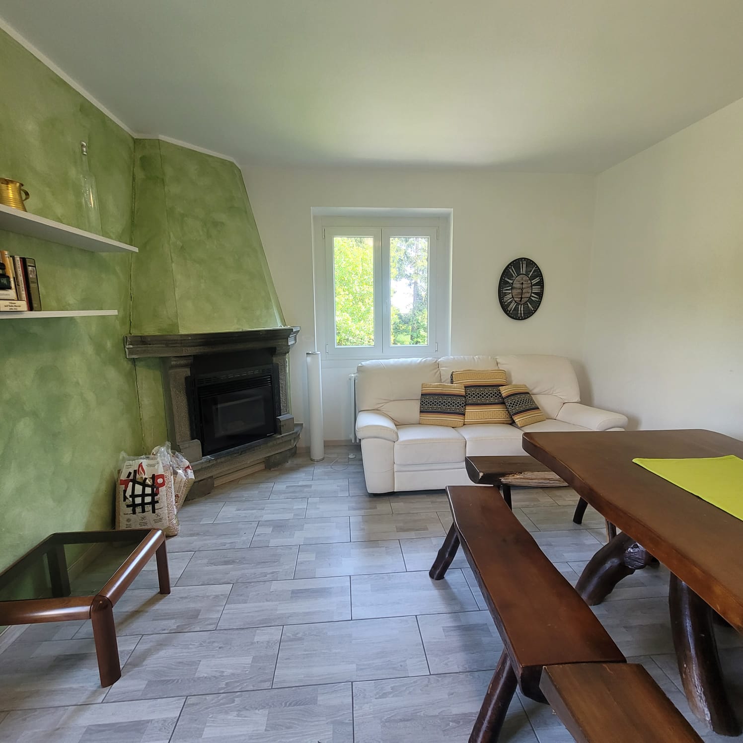 - Open space con cucina attrezzata e macchina caffè Nespresso, zona salotto con grande tavolo, camino a pallets, divano e televisore