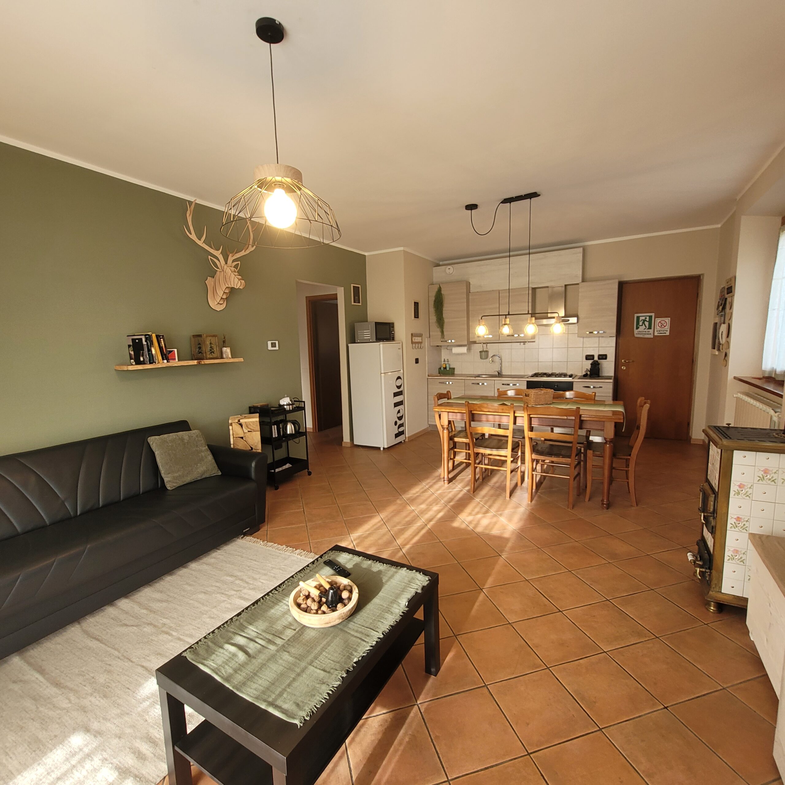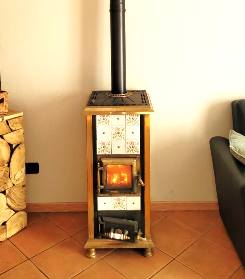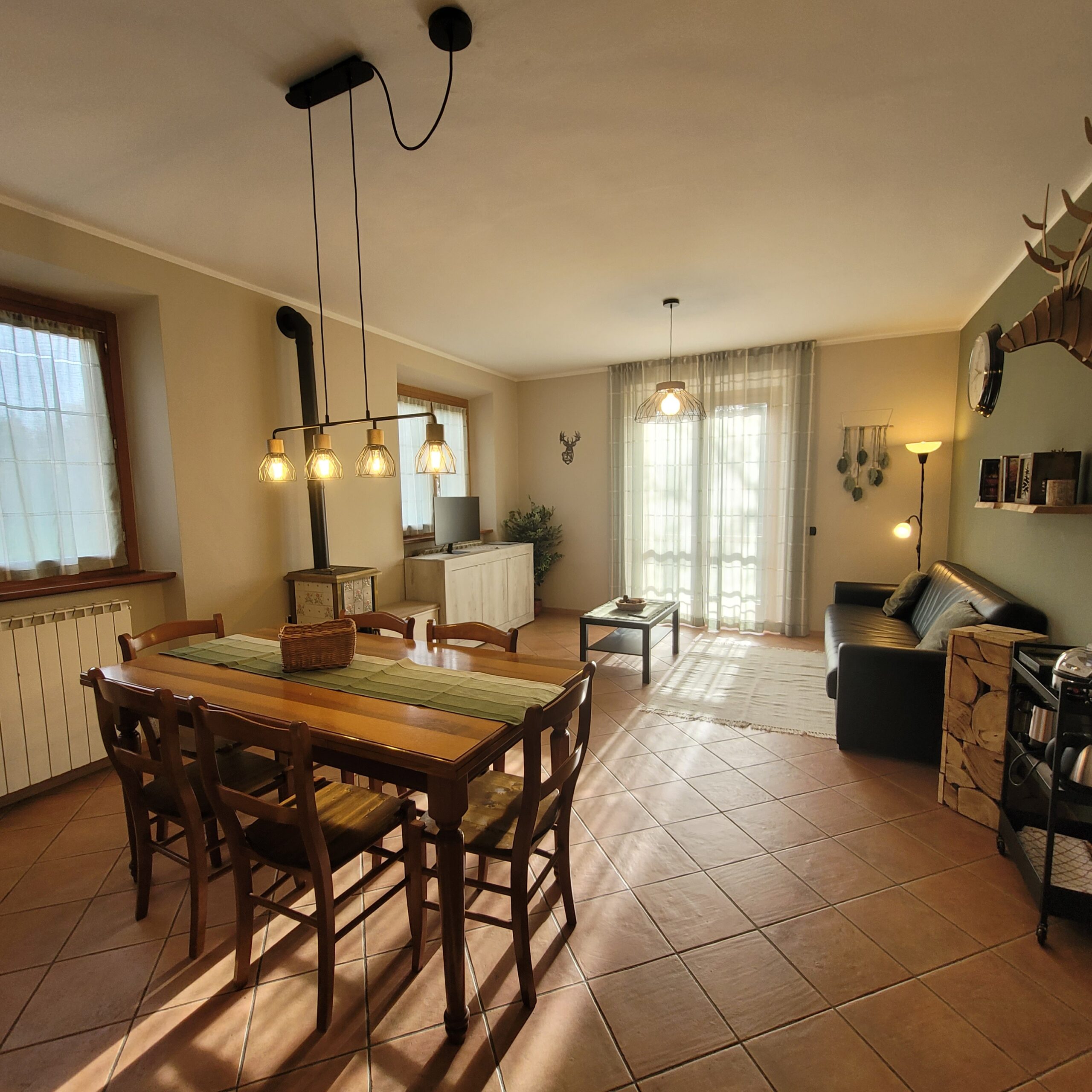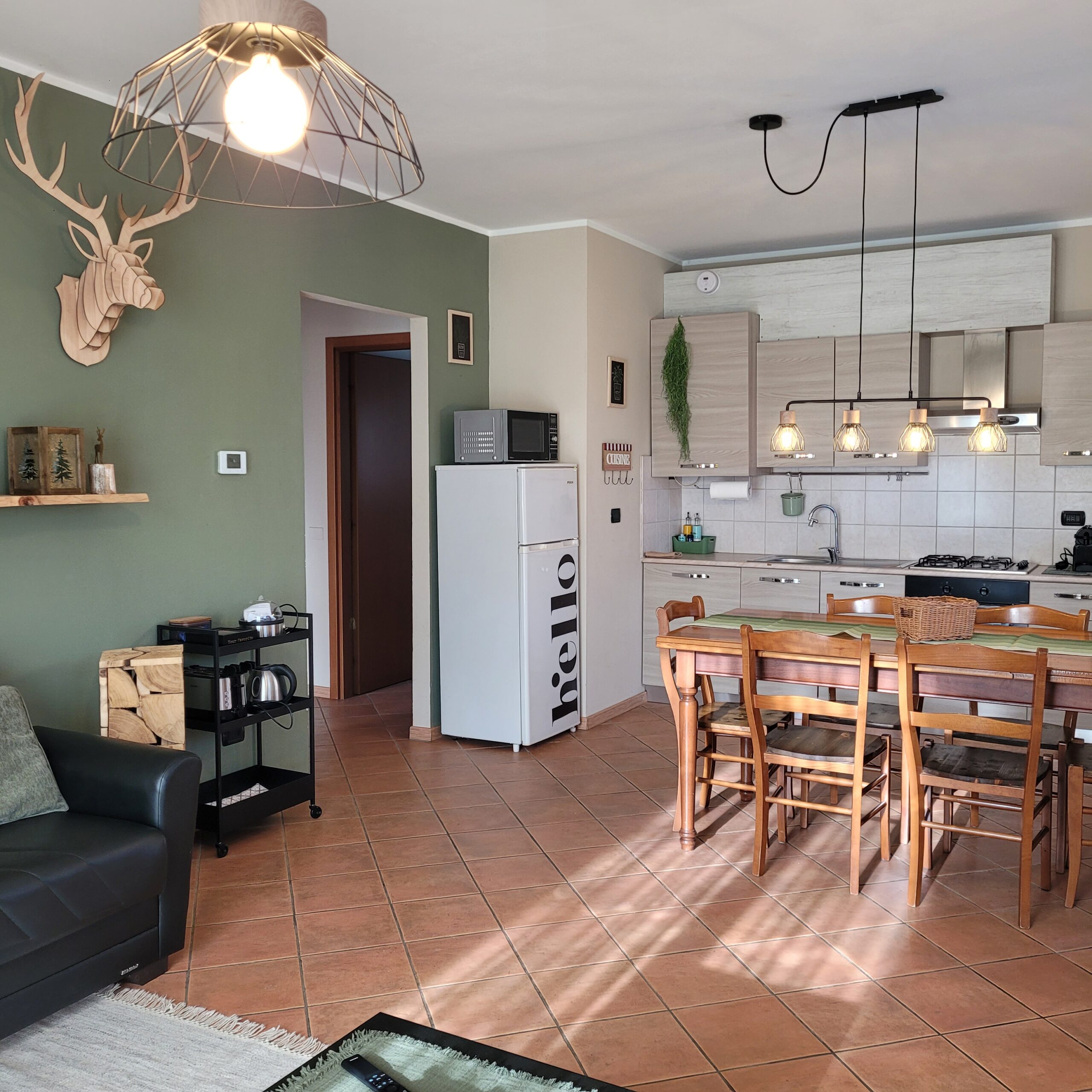 - Open space con cucina attrezzata e macchina cafè Nespresso, zona salotto con stufa a legna , divano e smart monitor tv con servizio Netflix