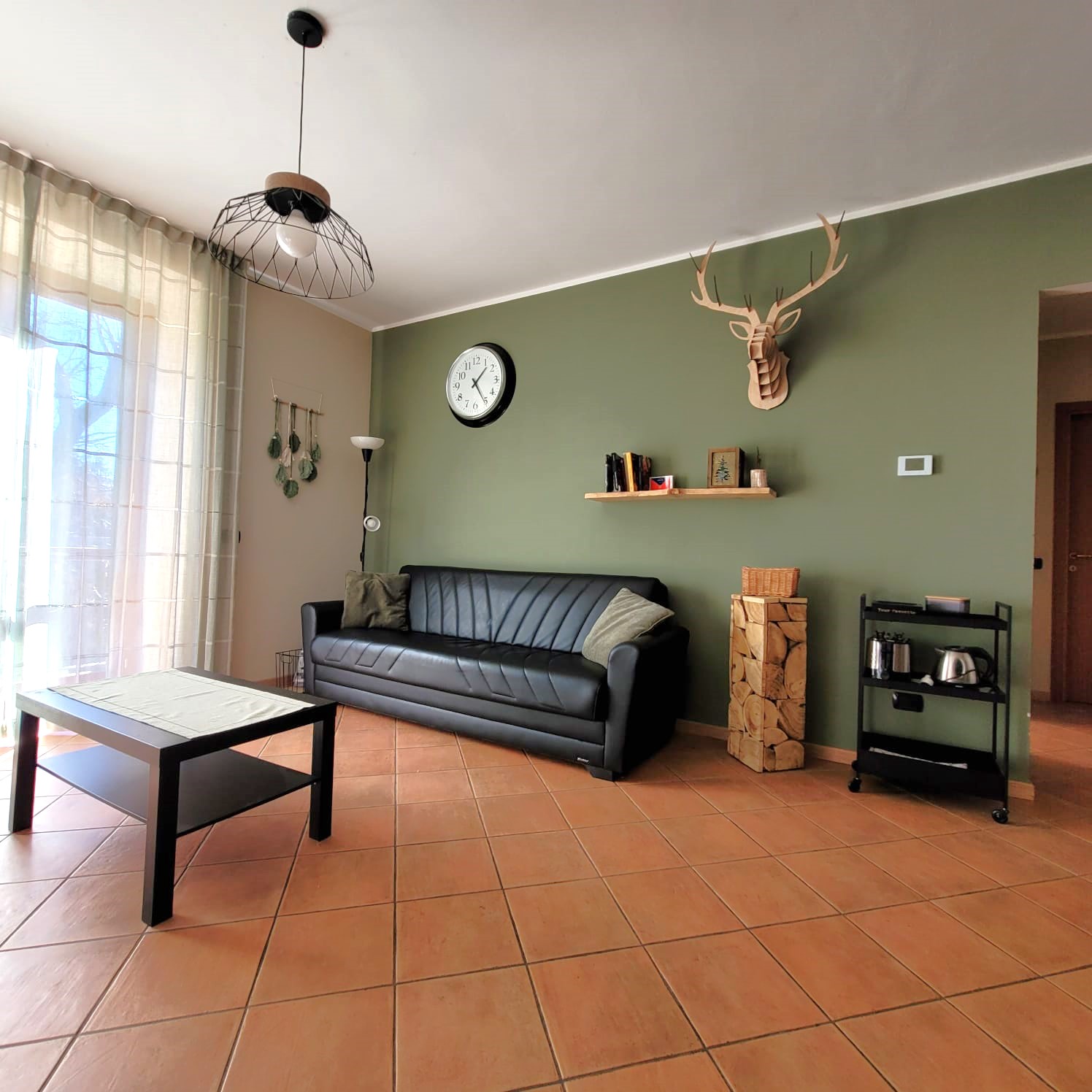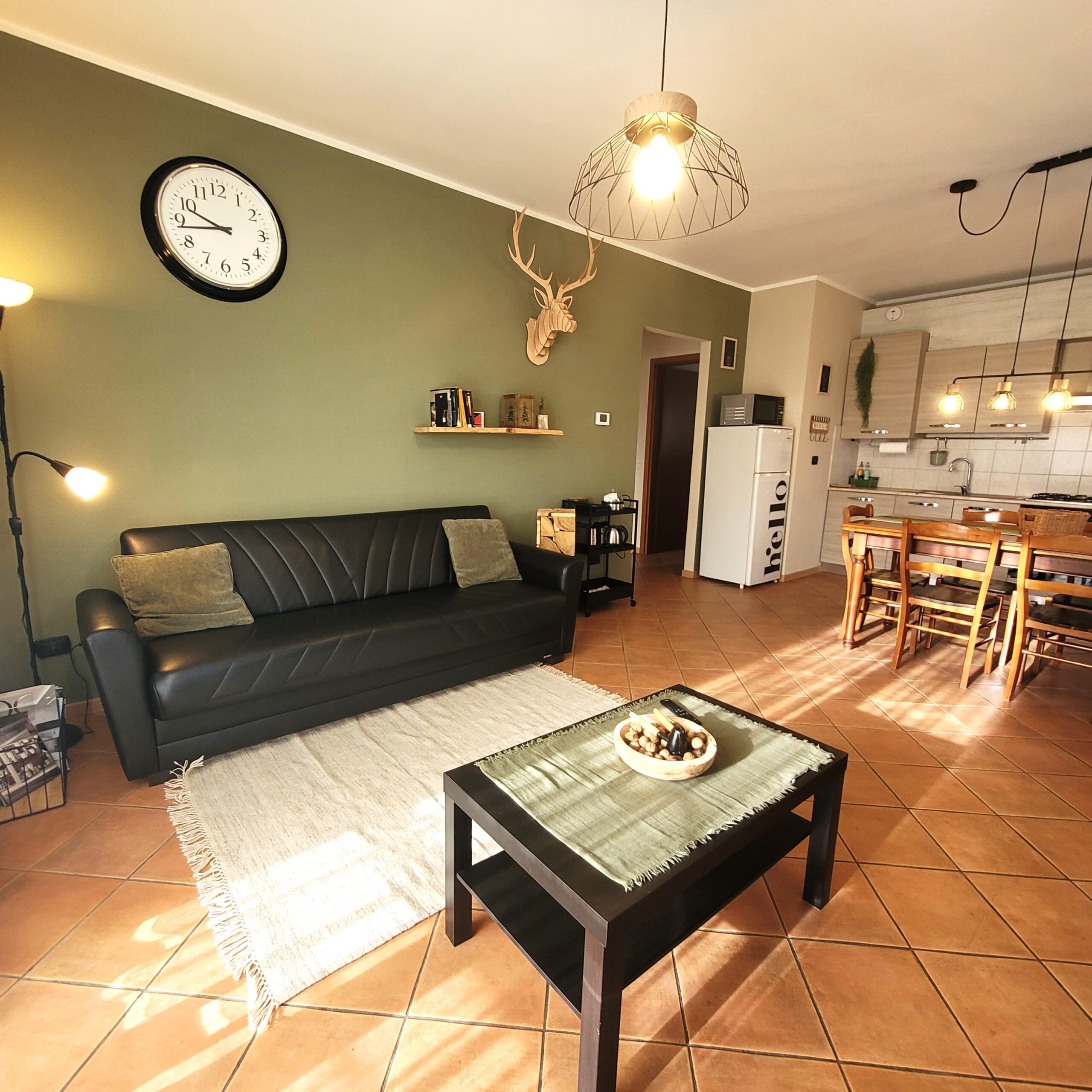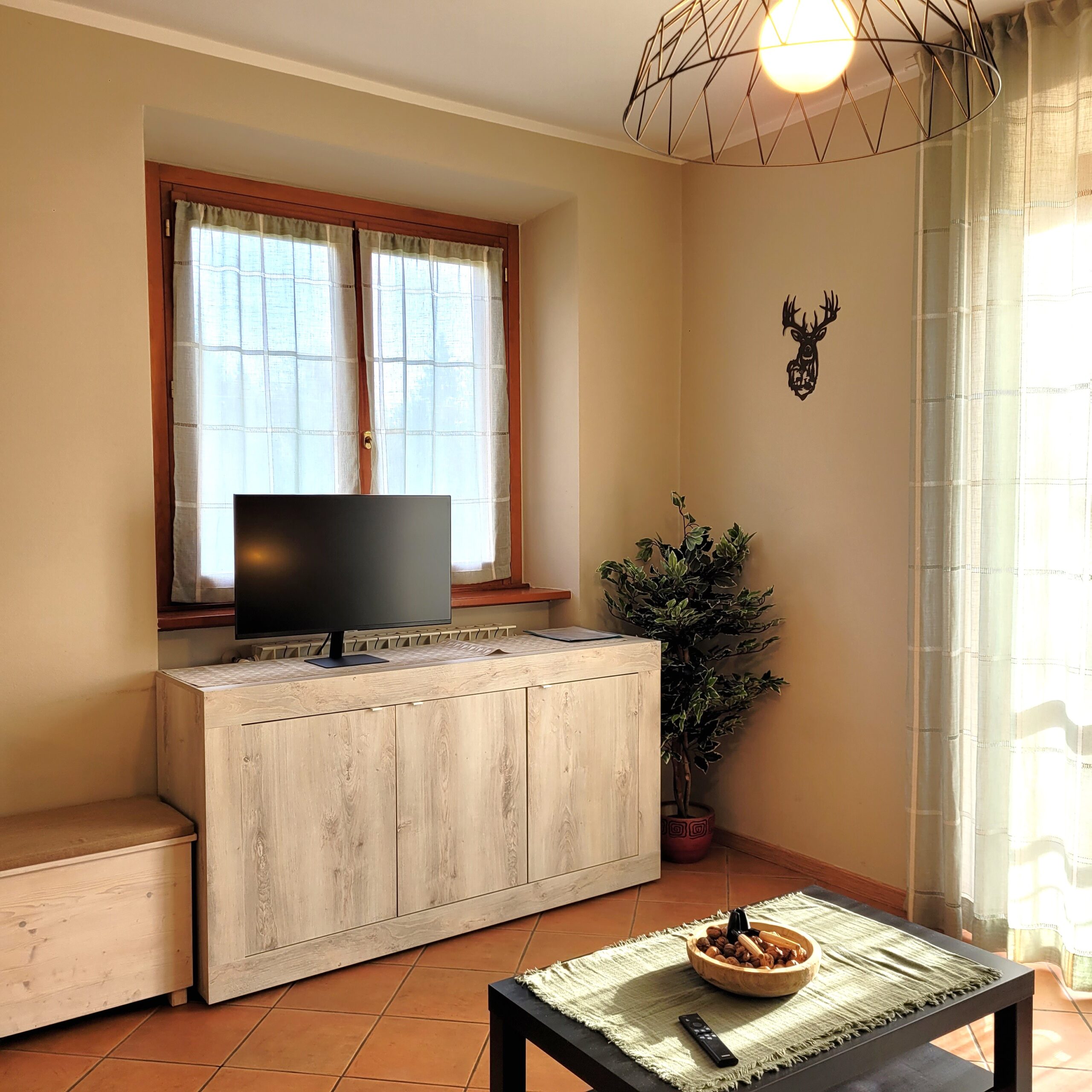 - Open space con cucina attrezzata e macchina cafè Nespresso, zona salotto con stufa a legna , divano e smart monitor tv con servizio Netflix